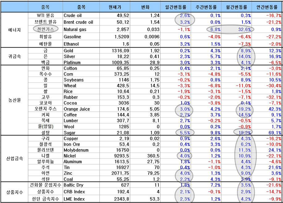 상품 가격은 원유가격이 WTI 2.6%, 브렌트유 3.2%가 올랐다. 천연가스 가격은 최근 한달동안 32.6%가 오르면서 향후 에너지 가격 상승을 실감하게 할 듯 하다. 석탄 가격도 2.2%가 오르며 월간으로는 3.9%의 상승을 기록하고 있다.
