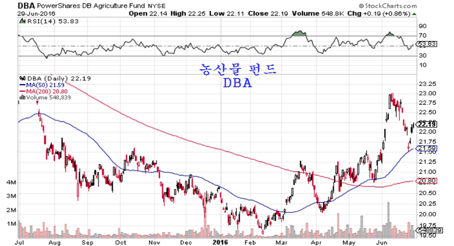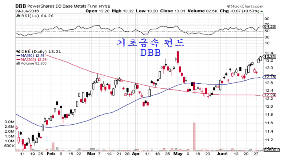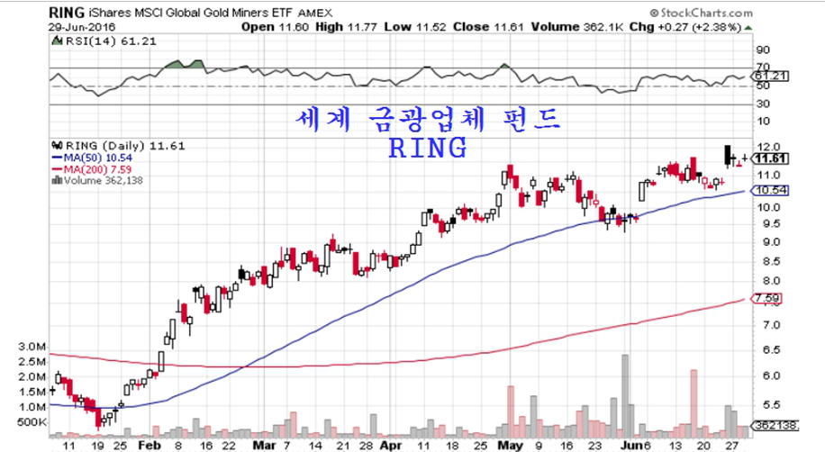 귀금속 가격은 브렉시트를 핑계로 급등하며 5일 전대비 금 4.3%, 은 5.7%, 백금 3.3%가 올랐다. 그러나 실제로는 향후 달러가치 하락을 대비하여 금가격이 오른다고 할 수 있다. 1개월 전에 비해서는 금 8.9%, 은 14.0%, 백금 4.1%가 오르며 매우 가파른 상승이 이어지고 있다. 경기 회복 국면에서는 금보다는 은값이 더 오르고, 은보다 금광업체 주가가 더 오른다. 참고로 금광업체들을 묶은 펀드는 RING 일는 펀드 이름으로 거래되어 주식처럼 사고 팔 수 있다.