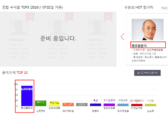 맹호 황윤석은 7월1일 현재 57%의 수익률로 1위를 독주하고 있다.