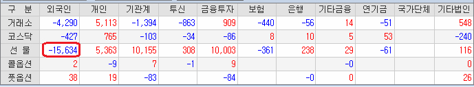 그리고 코스피에서도 외국인과 기관의 쌍끌이 매도가 지속되고 있습니다. 이런 와중에 개인은 코스피와 코스닥, 선물 모두를 사주면서 수급상 굉장히 안좋은 상황을 연출해냈습니다. 이것이 앞으로 더 심한 하락으로 이끌 가능성을 제기하고 있는 것이구요.