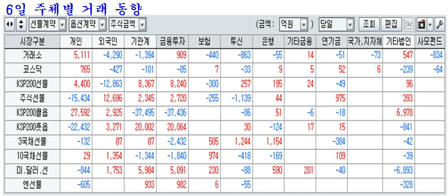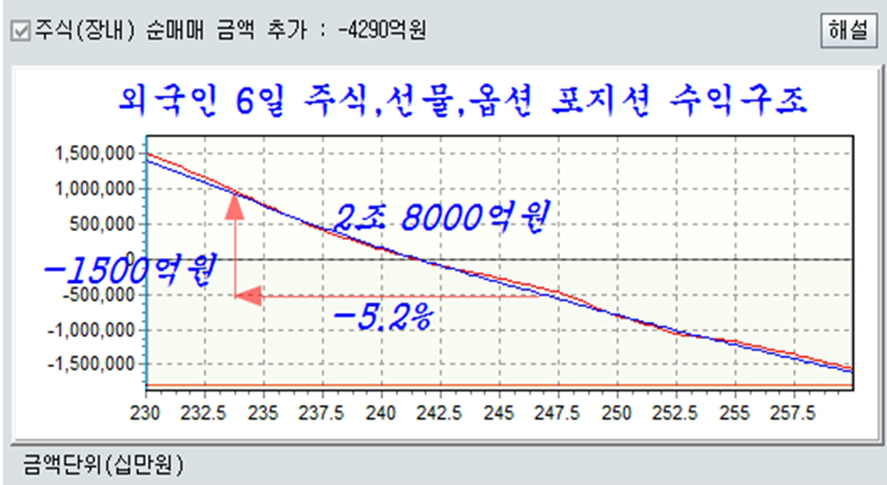 외국인은 현물 4290억 원에 선물 1조 5000억원 그리고 풋옵션 매수를 합하여 주식으로 환산하면 대략 2조 8000억원의 규모의 포지션을 취했고, 대규모 선물 매도에 따른 프로그램 매도로 주가가 조정을 거쳤다.