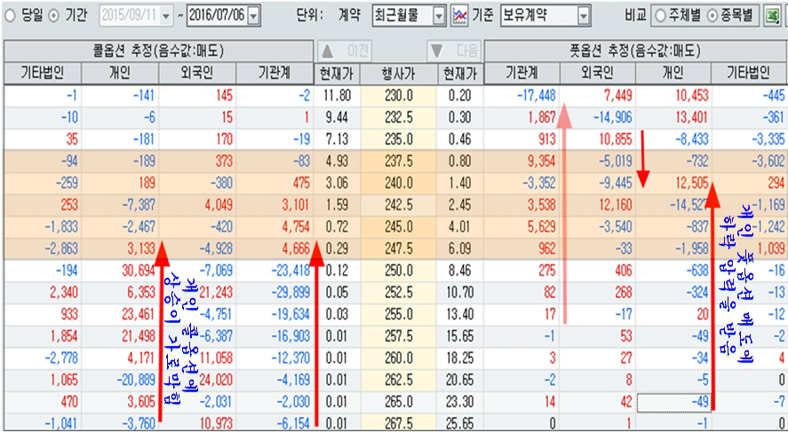 7월 5일 브렉시트의 불안심리에서 벗어난 개인이 콜옵션 매수와 풋옵션 매도를 늘리면서 6일은 외국인의 대규모 공세가 있었다. 마치 스타크래프트 물량 전을 보는 듯한 게임이다. 외국인의 투기적 게임을 위해서 동원할 수 있는 역량이 어디까지인지를 잘 보여주는 예라고 하겠다.