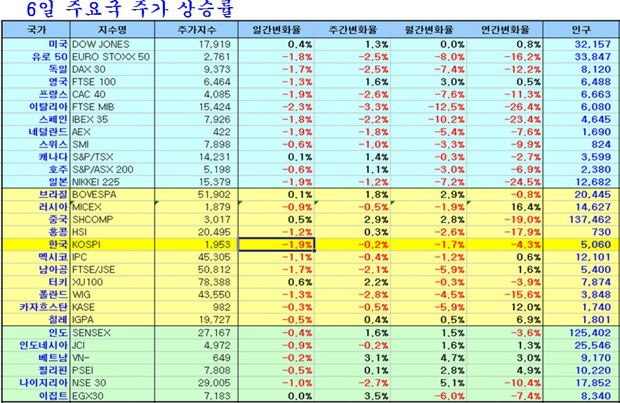 6일 세계 주식 시장은 다음주 옵션 만기를 앞둔 한국과 유럽 그리고 ELW 가 강한 홍콩시장이 비교적 강한 변동을 보였다. 파생상품이 없는