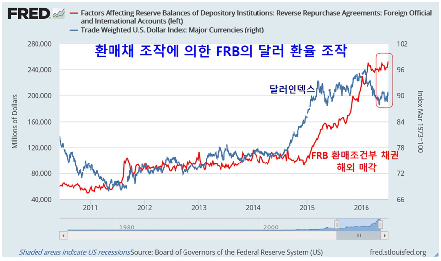 브렉시트 때문이 아니라 국제시장에서 달러를 회수하여 달러가 부족해졌기 때문이다. 위의 자료를 보면 2014년 연말 이후 FRB는 환매조건부 채권으로 해외의 달러를 거둬들이면서 달러가치를 끌어 올리는데 주력하고 있고, 2016년 이후 달러 하락이 시작되었음에도 지지권 이탈을 방어하기 위해 환매조건부 채권 매각 조작이 이어지고 있다.