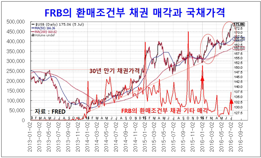 시장에 2014년 이후 FRB는 국채가격에 직접적인 개입을 해 오고 있으며 의도적으로 국채가격을 끌어 올리고 있다. 이런 억지스런 국채가격 상승을 보면 어쩌면 미국이 FRB 개입이 없이는 자체 신용으로 재정 적자를 메울 국채 발행이 불가능할 정도로 부실화되고 있지 않은지 의문을 갖게 한다.