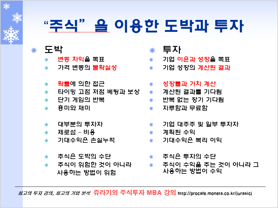 사용하는 방법은 도박에서는 확률에 더해 노련한 감각과 기술이지만, 투자에서는 치밀한 조사를 토대로 한 미래 수익의 계산과 이후의 관리이다.