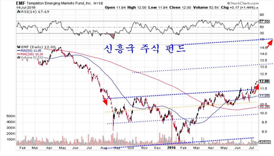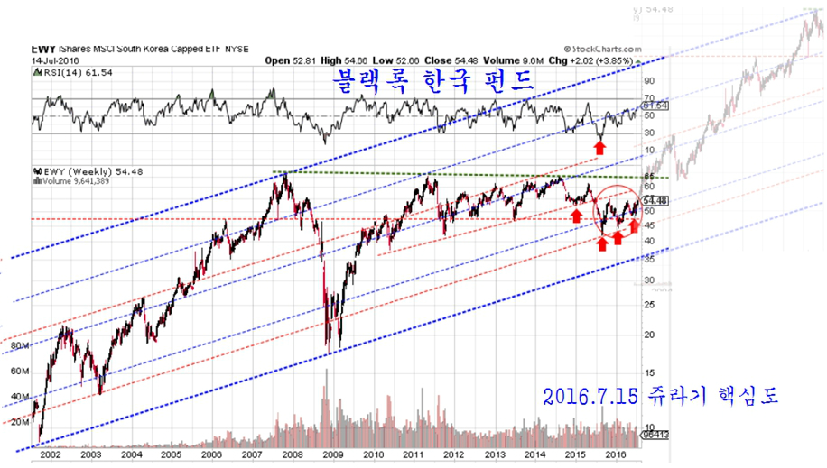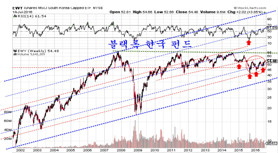 자산 운용규모 4조 5000억 달러 ( 5000조원 ) 규모로 세계 1위의 자산운용사인 블랙록이 운용하는 한국펀드 EWY도 전고점을 넘어 상승 추세로 진입하고 있다.