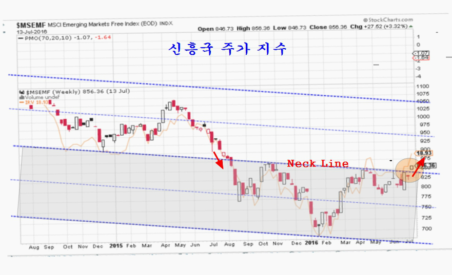 짧게는 2015년 8월 이후의 약세 국면을 벗어나 상승의 의미를 갖지만, 길게 보면 2011년 이후 세계 경기 둔화기의 하락 국면을 마감하고 역헤드앤쇼우더 추세 전환 패턴과 함께 장기 상승 추세로 전환되는 의미가 있다.