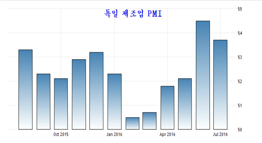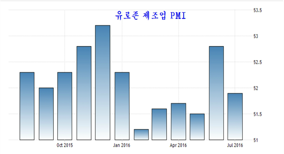 유로존의 제조업 PMI지수는 4개월 위축 이후 급격한 호전이 나타났던 6월보다 감소하였지만, 52에 가까운 값을 보이며 추세적으로 상승하고 있다. 특히 가장 비중이 큰 독일이 제조업 경기는 완연한 회복세이다.
