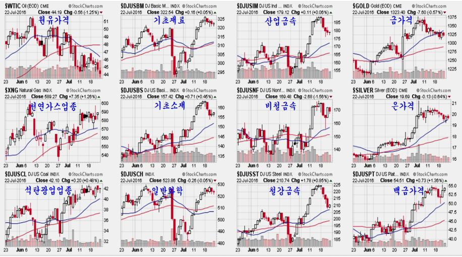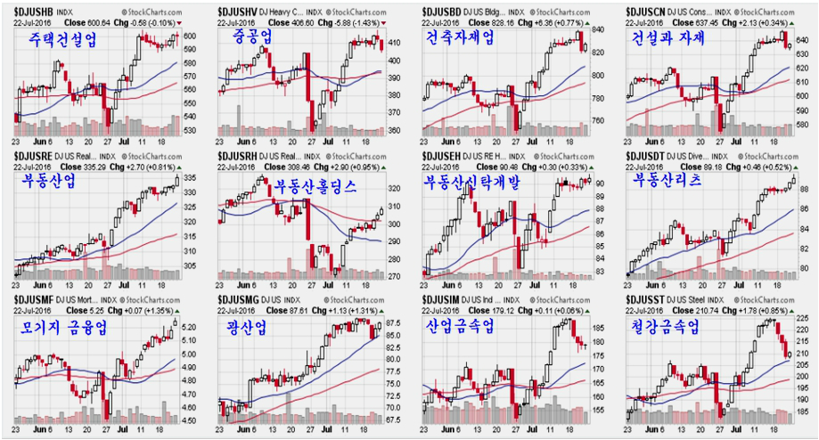 뉴욕시장은 미국의 2015년 조정을 거쳤던 주택 임대료 상승이 재개 되면서 부동산과 주택 건설 및 건축자재 산업이 활발하게 회복이 되는 모습이다. 강한 상승을 했던 주택건설업 지수가 10일 정도 숨 고르기 조정을 마쳐 상승을 준비하는 모습이고, 지난주 하락 조정을 거친 철강과 금속은 지지권에 접하여 다시 상승이 시작 될 위치이다.