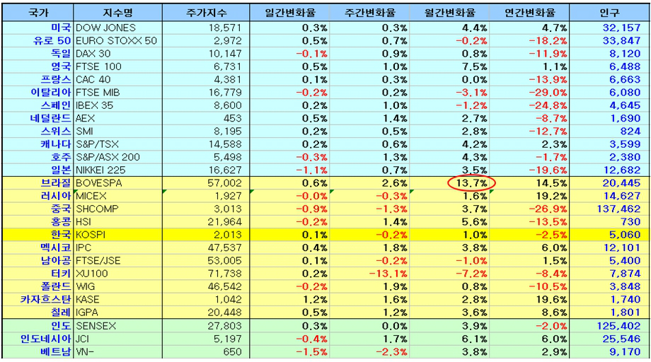 여하튼 이런 상승에 저항하는 기관의 매매 때문에 최근 1개월 활발한 세계 시장의 흐름에 비해 종합주가지수의 상승은 초라하다. 브라질 증시가 13.7%가 오르는 사이 종합주가지수는 1.0% 상승에 머물고 있으며