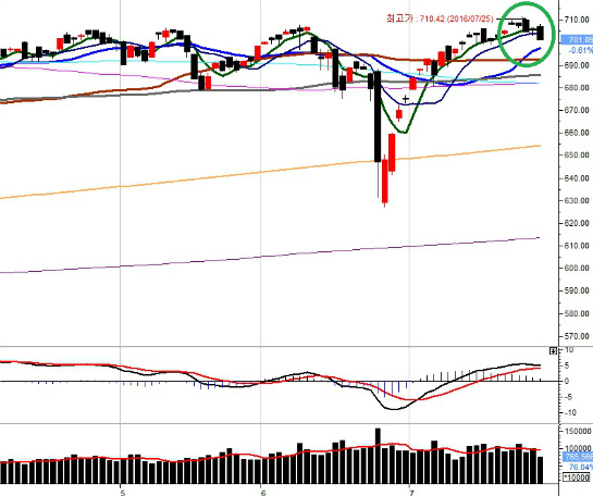 코스닥 지수는 7월 들어, 675.09 pt. è 702.31 pt. 4.03% 상승세를 보였지만, 아래의 지수