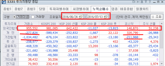 브렉시트이후 4조원이상의 순매수를 기록하고 있는 외국인들이 매수 강도가 약화되거나