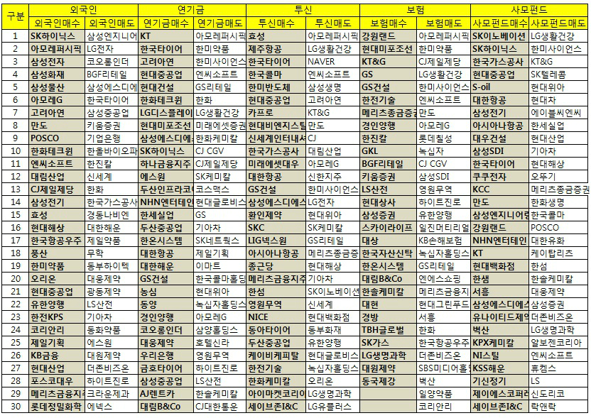 (이하 표에 표시된 종목들은 각 기관 및 외국인이 최근 3일 동안 연속 순매수 및 순매도