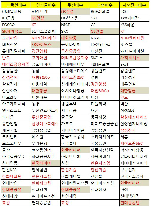 순매수를 보인 종목들이다. (음영칸은 3곳이상의 기관/외국인이 순매수를 보인 종목)