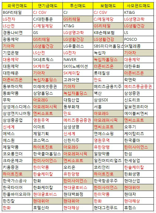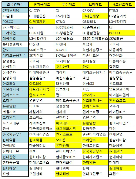 순매도를 보인 종목들이다. (음영칸은 3곳 이상이 집중 매도한 종목)