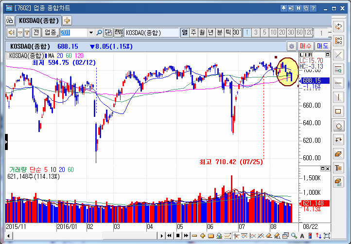 오늘은 시장의 하락이 시작되는 시점이 아닌지 염려되는 장입니다. 오늘 코스닥 지수가 크게 하락하며, 120일 이평선을 하방 돌파하였습니다.