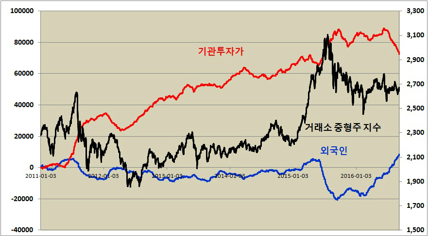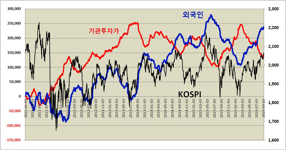 두 번째 의문은 더 크다. 지수 흐름을 쫓아가겠다는데, 과연 기관투자가들이 지수 흐름을 쫓아가는 전략을 구사할 능력이 있는지 궁금하지 않을 수 없다. 다음의 챠트를 보면 역시 지난 5년간의 KOSPI 지수와 기관 및 외국인의 매매동향의 흐름이다. 한 눈에 봐도 알 수 있듯이 KOSPI 흐름은 철저히 외국인의 매매 패턴과 같은 궤적으로 보이고 있는 것에 반해 기관은 정확히 역의 상관성을 보여주고 있기 때문이다. 지수를 쫓아가기는 커녕 정반대의 운용 결과를 보여온 국내 기관투자가들의 능력상 패시브 전략의 성공 가능성이 있을까?