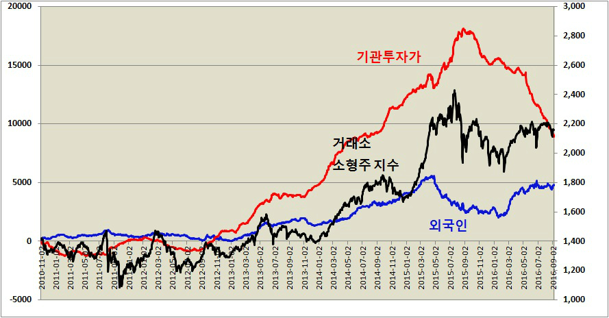 다음의 그림은 코스닥 시장에서 보여지고 있는 지난 5년간의 매매흐름이다. 이그림에서 보듯 기관투자가들의 코스닥 ’무조건’ 탈출이 도를 넘어서고 있다. 이 즈음 되면, 무차별적인 매도라고 볼 수 있다.