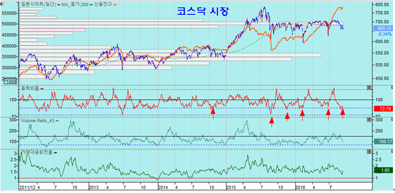 쥬라기: 코스닥 시장은 등락비율이 72.79로 과거 바닥을 만들었던