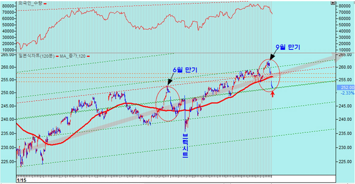 그러나 120분 선물 지수의 움직임을 보면 주가를 움직이는 외국인은 6월 선물 옵션 만기 전후와 마찬가지로 9월 선물 옵션 만기를 전후 하여 변동을 만들었을 뿐, 장기적인 추세는 상승이 이어지고 있다.
