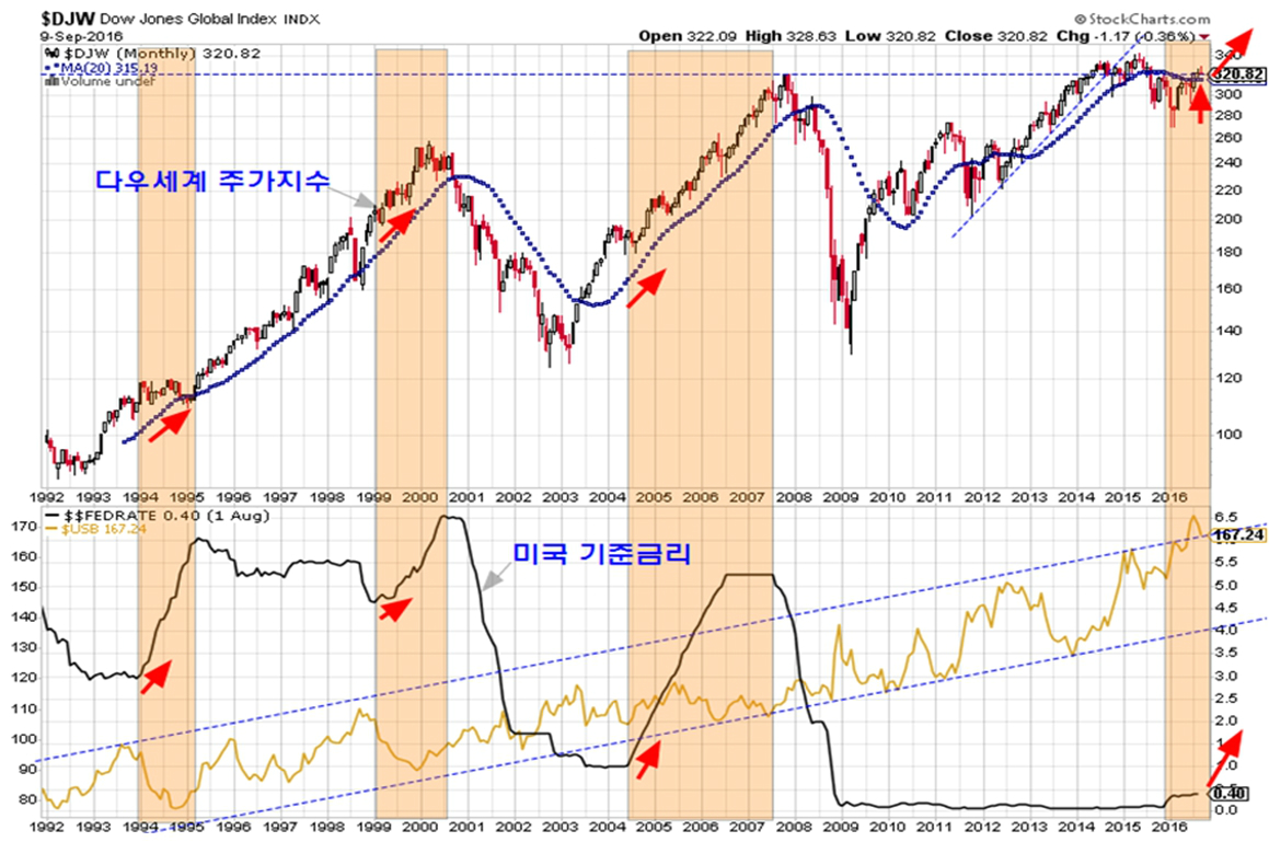 실제 미국의 기준 금리와 세계 주가지수를 비교해 보면 디플레이션이 우려되어 금리를 인하라 대는 주가 급락이 나오고, 금리를 인상할 때 주가는 장기로 상승한다. 주가가 상승하는 인플레이션에 금리를 인상하고, 주가가 하락하는 디플레이션에 금리를 인하해야 하는 원리를 알면 당연한 일이지만 시장에서는 오를 때 하락한다고 하고, 내릴 때 상승한다고 하는 관행에 따라 금리를 올리면 주가가 하락하는 것처럼 뉴스를 통해 선전하는 경우가 많다.