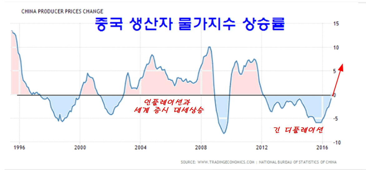 실제 세계의 원자재 가격을 결정하는 중국에서는 철강, 화학, 시멘트, 유리, 석탄 등 제품 가격들이 매우 빠르게 오르고 있으며 이것은 중국이 수출하는 상품을 통하여 전세계에 인플레이션을 준비하고 있다. 이런 이유 때문에 미국은 당연히 금리를 서둘러 올려야 하며, 미국이 금리를 인상하면 안전자산인 채권시장에서 자금이 빠져 나와 주식시장으로 유입되며 주가가 오르게 되는 것이다.