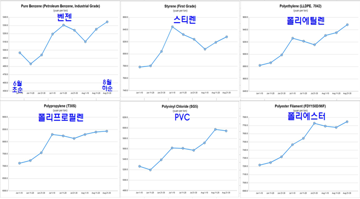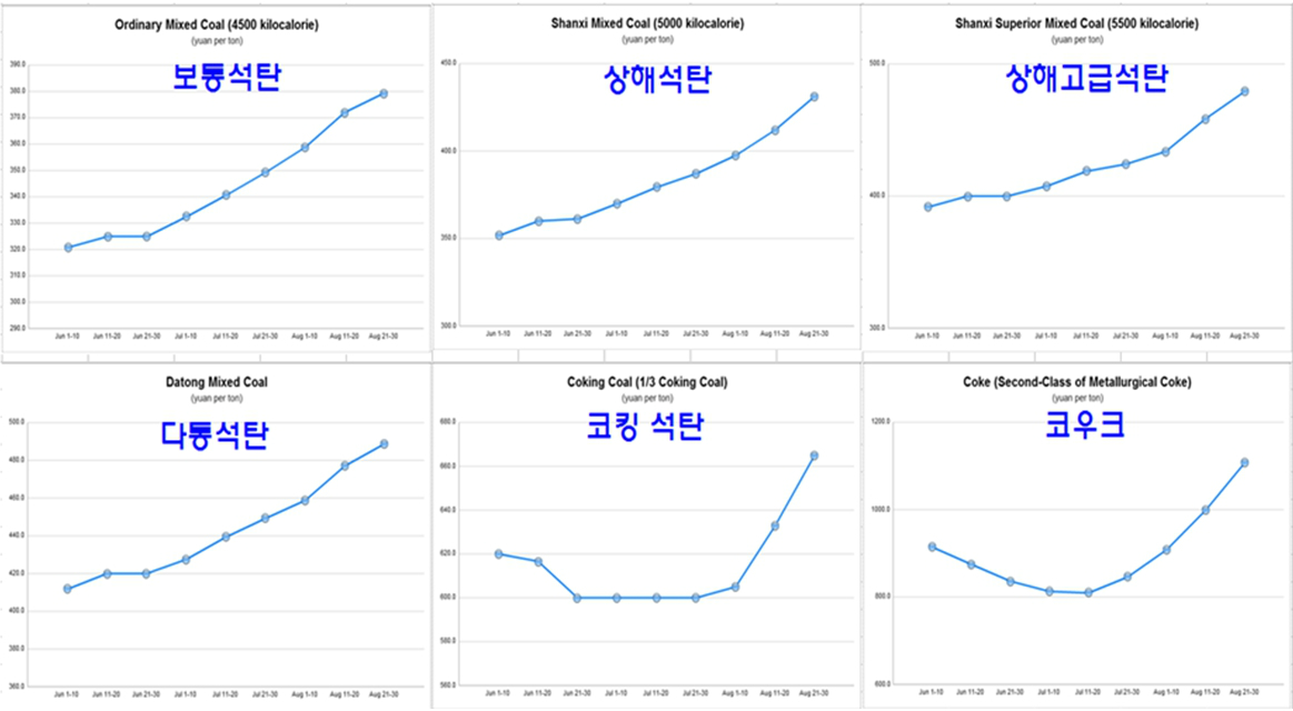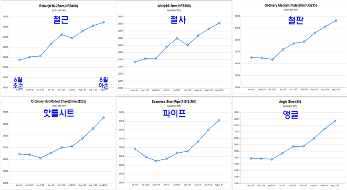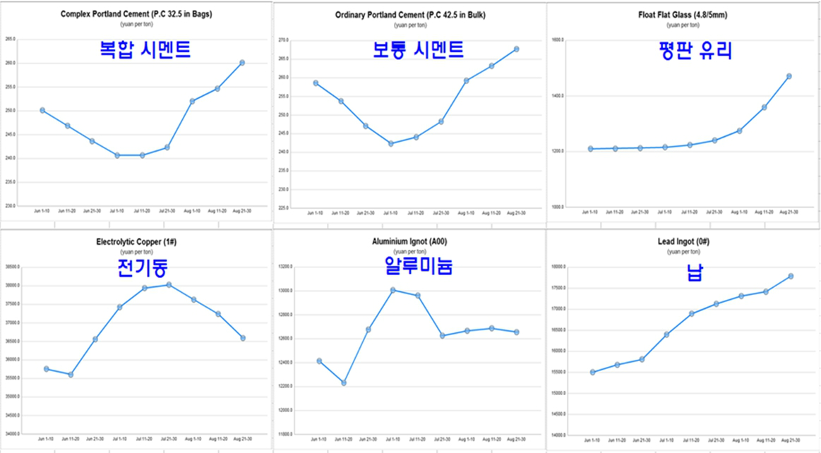 그러나 최근 5년 만에 생산자 물가지수는 마이너스 하락을 끝내고 상승으로 돌아설 모습이다. 제품가격이 하락하던 기업들이 이제 제품가격을 올릴 때가 되었다는 의미이다. 시멘트도, 원유도, 철강도, 기계도, 해운 운임도, 조선 가격도, 주택 건축비도 모두 가격이 오를 때가 된 것이다. 다음은 2개월간 중국의 시중 상품 가격의 변동 추이이다.