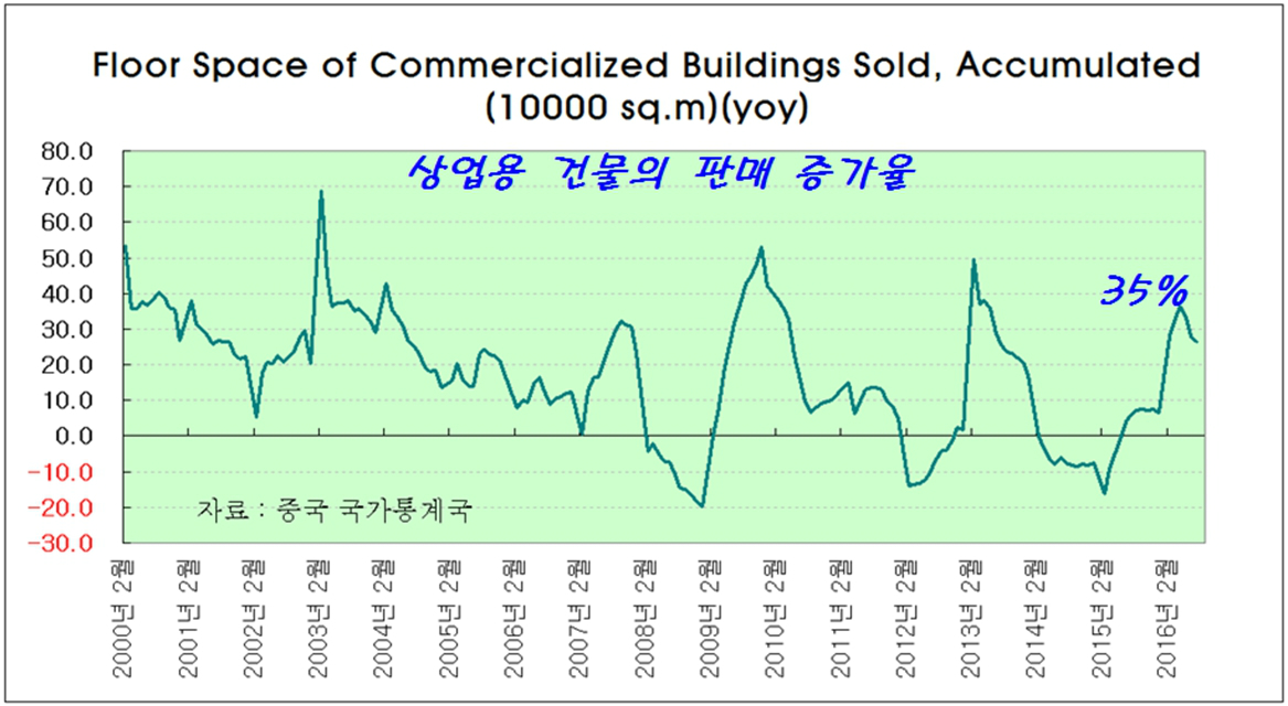 이 결과 중국의 주택가격이 2015년 4월을 저점으로 꾸준한 상승을 하면서 상업용 건물 판매 증가율이 35%에 이를 정도로 거래가 살아나고 있다.