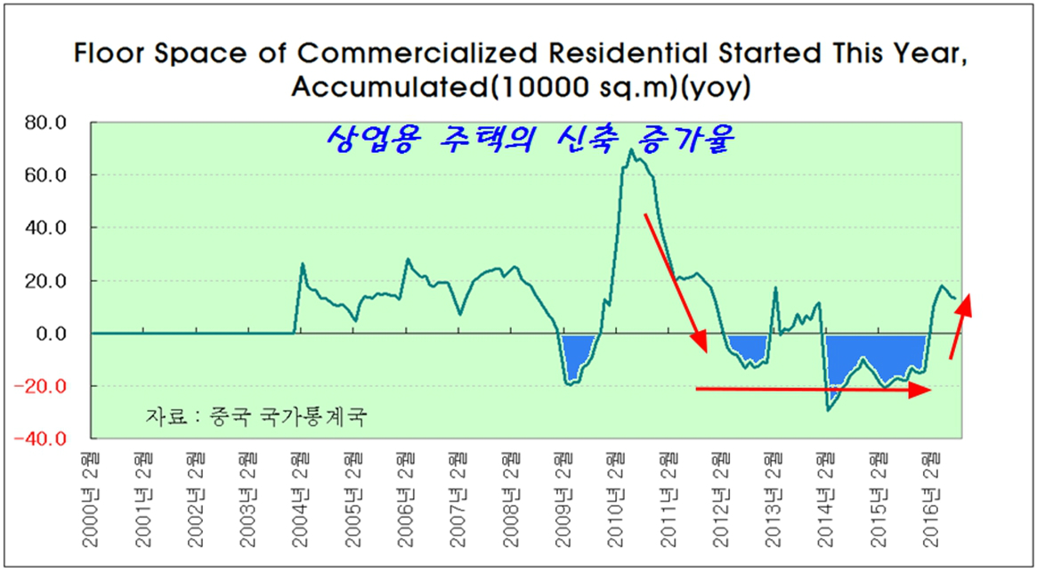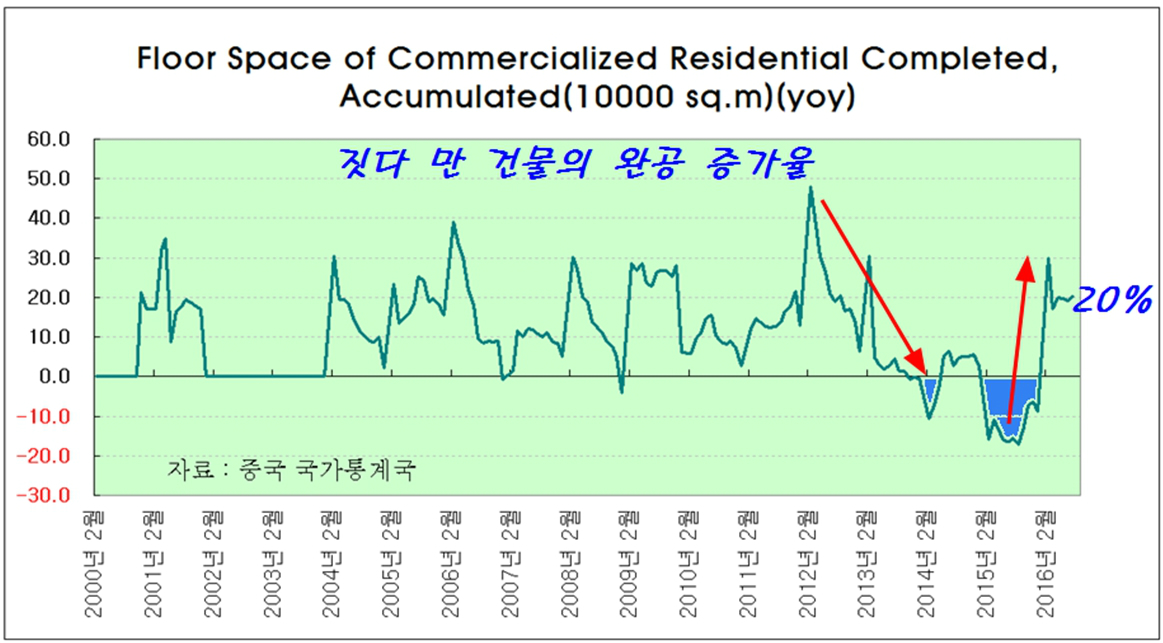 따라서 그간 공사중인 전체 건축물이 계속 감소 추세를 보이다가 최근 상승으로 돌아서고 있다. 이 건축 중인 공사면적의 합계가 중국의 제조업과 경제성장에 직접적인 영향을 미치므로 이 공사물량의 감소와 함께 둔화되던 중국의 경기가 이제 다시 성장으로 움직이게 된다.