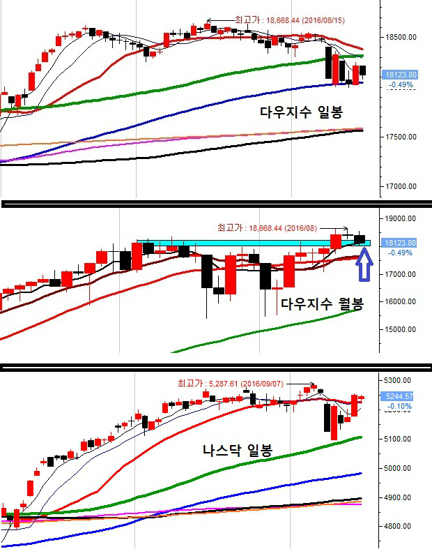 다우지수는 일봉상 추세 복귀를 만들어내지 못했으나, 월봉상의 중기 지지선은 유지하고 있는