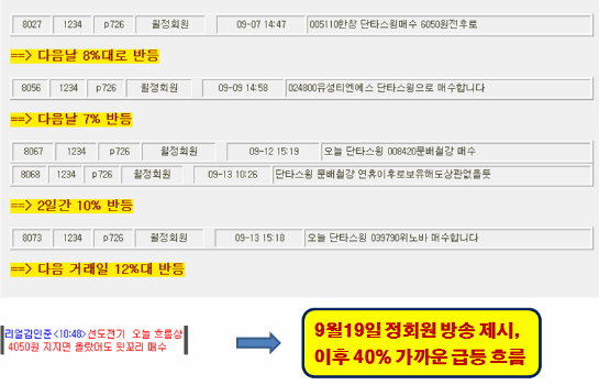 9월 12일에도 장중 공개방송에서 지수의 추가 급락에도 불구하고 매도하면 안된다는 의견을 반복 제시한바 있다.