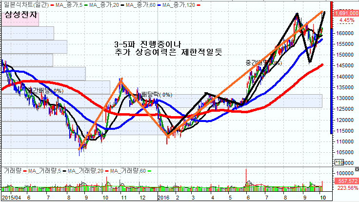 현재 삼성전자의 주가차트를 보면 파동논리상 3-5파가 진행중이며 5파의 상승폭으로 볼때 상승의