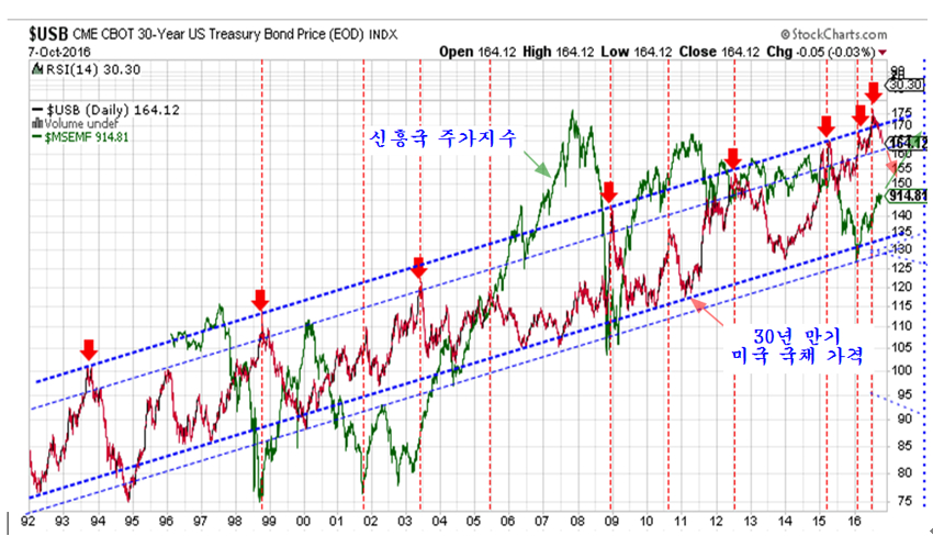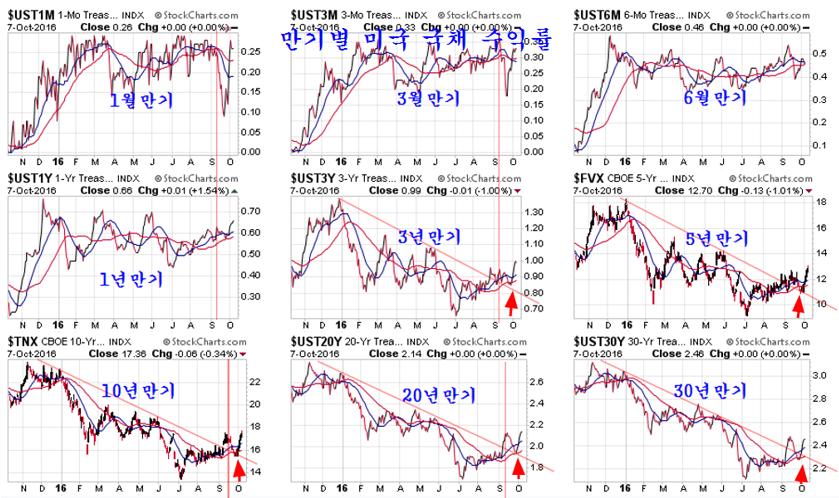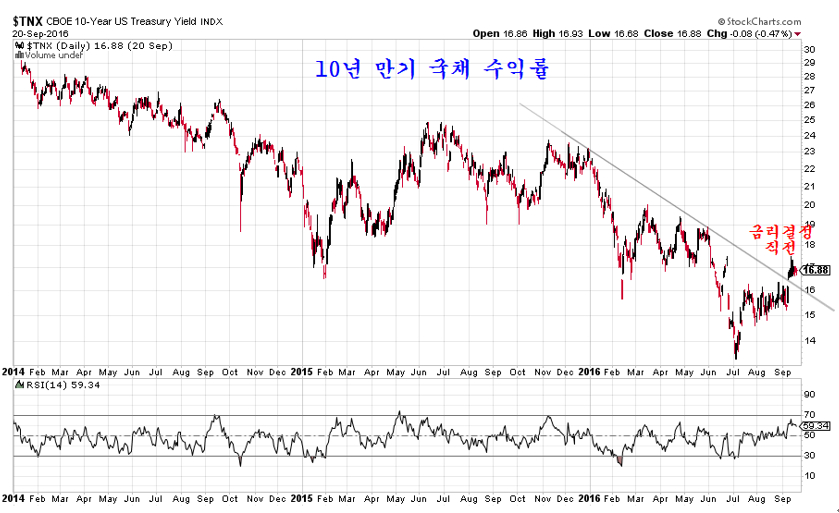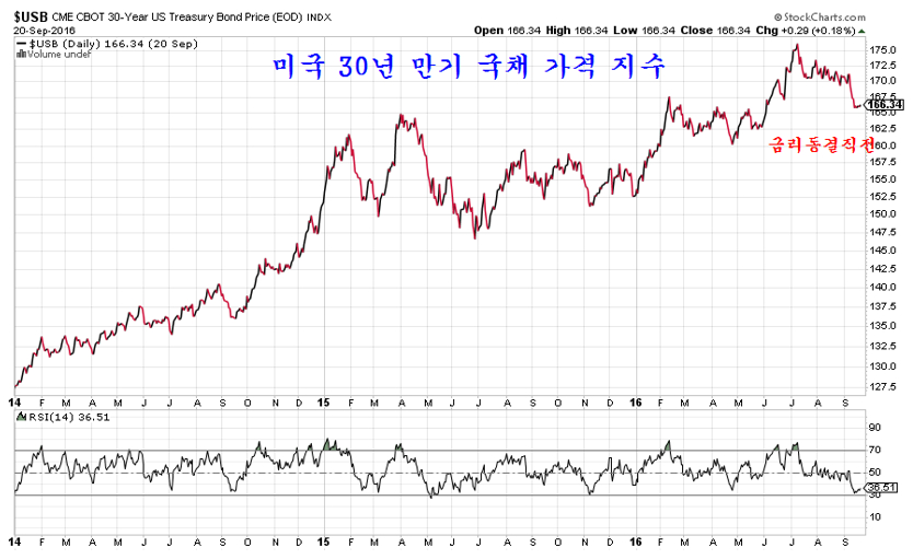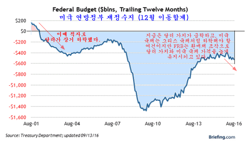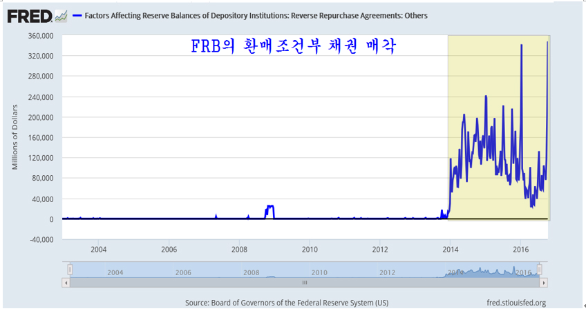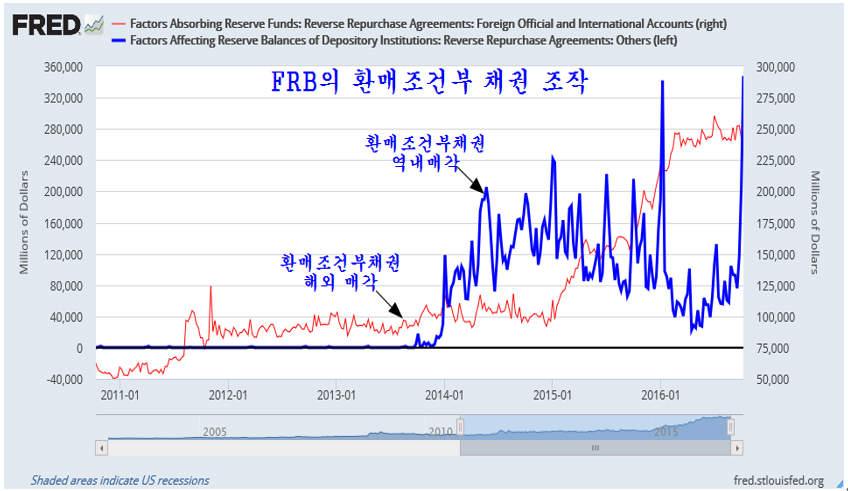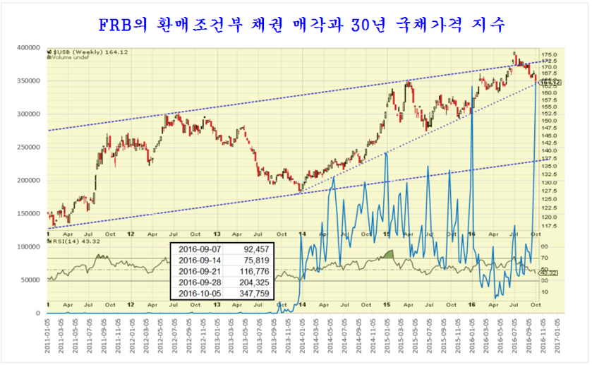 재정적자에 허덕이는 미국 채권 가격을 유지하여 국채 발행을 하려는 안간힘. 지난 9월 21 미국의 금리 결정을 앞두고 채권가격은 지지선을 위협하고 채권수익률은 저항선을 넘어 상승 추세를 앞두었다. 만일 미국이 금리를 인상하고 금리 인상과 함께 채권가격이 하락했다면 안전자산이 채권시장에서 자산이 이탈하여 수익자산인 주식과 상품으로 이동하면서 세계 주가는 견실한 상승을 할 터였다. 그러나 예런 의장이 이끄는 미국 FRB 이사회는 유가 상승에 따라 물가가 상승하는 것이 불을 보듯 뻔한데도 불구하고 금리 인상을 하지 않고 금리를 동결했다. 미국 기준금리 또 동결…대선 이후 12월 인상 가능성 JTBC 2016.09.22 미국 금리인상에 관한 갑론을박 월간마이더스 2016.10.7 이와 함께 하락하던 채권의 가격은 다시 올랐고, 상승을 준비하던 주가는 하루 상승 후 재차 지루한 조정이 이어지고 있다. 7월 이후 미국 뉴욕시장이 헤드엔쇼우더 패턴의 저항인 네크라인을 돌파하면서 상승 추세로 진입한 것이 분명한데도 주가가 상승 추세를 형성하지 않고 지루한 조정을 보이는 것은 이런 FRB의 시장 개입이 작용하기 때문이다. 실제 FRB는 금리를 동결하는데 그치지 않고 채권가격을 끌어 올리기 위해 시중에 채권을 2주 후 더 비싼 가격으로 되사준다는 약속하에 매도하는 환매조건부 채권 매각 규모를 크게 늘려 시중의 유동성을 흡수했다. 이처럼 시중의 돈이 FRB로 빨려 들어가니 일시적으로(매각된 채권은 15일 이내에 환매된다.) 시중은 돈부족을 겪으며 경기도 둔화되고 주가 상승도 지연되거나 일시 조정을 거치게 된다. 사실 FRB는 2014년부터 급락한 채권가격을 끌어 올리기 위해 환매조건부 채권매각이라는 이전에 거의 쓰지 않았던 통화정책을 적극적으로 이용하고 있다. 이렇게 FRB가 적극적으로 시장에 개입하여 시장의 가격을 조절함으로써 시장은 전통적인 방법으로 하는 예측이 모두 들어맞지 않는 특인한 장세가 이어지고 있다. 2014년부터 쥬글라 경기 사이클에 따른 경기 회복 국면이 예상되었지만 FRB가 채권가격을 끌어 올리기 위하 적극적인 환매조건부 채권 조작으로 시장에 직접 개입하고, 국내외의 달러를 흡수하면서 경기나 자산시장 모두 특인한 조정 장세가 이어지고 있다. 채권, 외환, 상품가격, 주가, 경제 등 모든 부문이 과거 시장 경제의 법칙을 벗어나 특이한 행보를 보이는 것은 FRB의 이런 적극적인 시장 개입에 기인한다. 시장의 발전을 막는 FRB 이런 적극적인 시장 개입은 2008년 금융위기후 확대된 연방정부 재정적자를 감당하기 위해 30년 만기 국채를 거의 공짜나 다름없는 이자율로 발행을 하기 위해 FRB가 채권 가격을 조작할 필요가 있기 때문이다. 만일 이런 FRB의 채권가격 조작이 없다면 미국의 재정은 유럽의 그리스보다 훨씬 더 나쁜 상태이다. 2016.7.16 신브렌턴우즈 체제 붕괴와 미국의 딜렘마, 그리고 시장 전망 쥬라기의 세상을 보는 창 미국의 재정적자는 연간 5000억달러 규모인데 최근 3주 동안 미국 FRB가 환매채를 매각해 흡수한 달러의 규모가 무려 3,477억 달러에 이른다. 문제는 과거 이처럼 환매채를 매각하여 시중의 달러를 회수하면 국채가격이 오르고 주가가 하락하였지만 최근 3주 동안 사상 최대 규모로 환매채를 매각했음에도 주가가 크게 하락하지 않고 국채가격은 오히려 하락하고 대신 국채 수익률은 상승했다는 점이다.