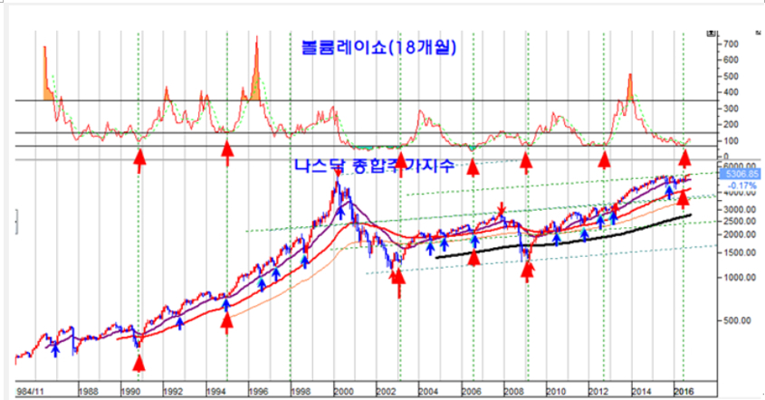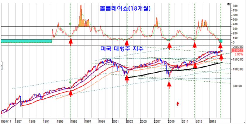 18개월 거래량 볼륨레이쇼 VR(18개월)을 보면 미국 증시나 한국 증시 모두 2003년이나 2008년과 같은 중요한 매물 바다권에 있다. 주식 시장의 매도할 물량이 얼마나 많은 지를 보여주는 볼륨레이쇼는 월봉 18개월을 기준으로 볼 때 매우 중요한 장세 바닥을 알려준다.