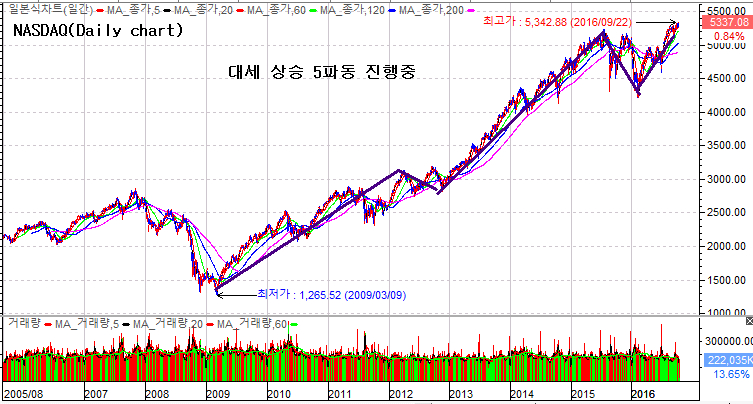 기술주중심의 나스닥지수는 기술적으로 대세 5파동이 진행중이며 추가적인 상승여력은은 남아