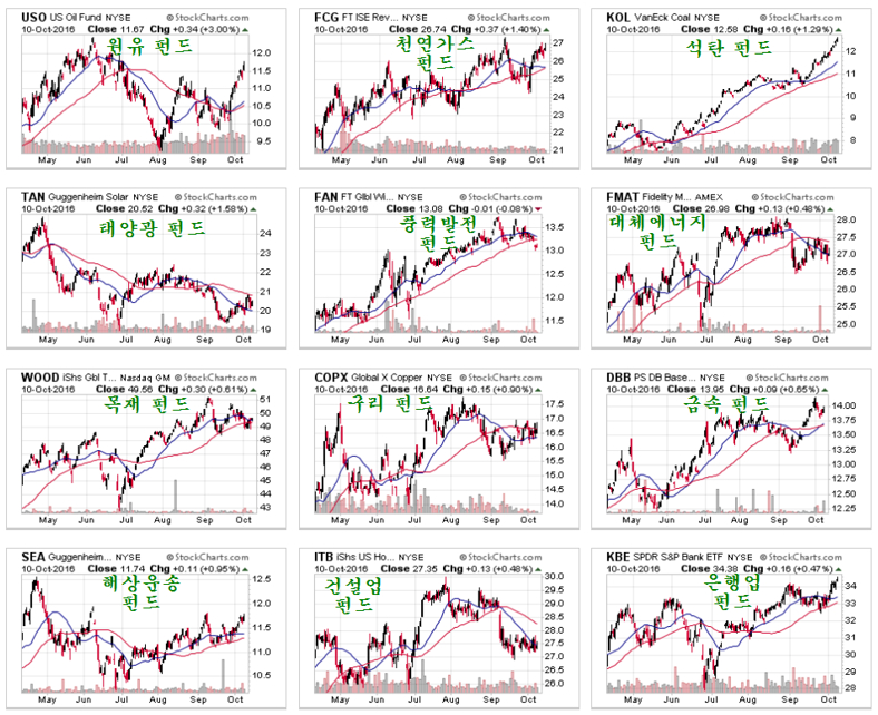 따라서 경기 회복과 관련한 에너지와 원자재 목재, 금속, 해운 등 경기에 민감한 산업의 펀드는 적극적으로 관심을 둘 때이다. 한국의 경제가 미덥지 못하다면 굳이 한국의 주식을 고르려 하지 말고 지구촌의 주식을 한데 묶은 펀드를 사서 투자하면 된다. 다음은 뉴욕시장에서 주식처럼 사고 팔 수 있는 지구촌 원자재 및 경기 민감 섹터 ETF 펀드이다. 직접 투자에 관심을 둘 만 하다.