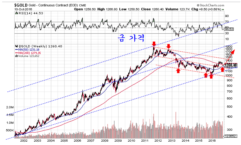 한편 이상 급락한 금 가격은 하락이 계속되기 어렵다. 금은 중국과 러시아 등 주요 무역 흑자국들이 외환보유고로 미국 국채를 사는 대신 금을 사서 늘리고 있어 지속적인 수요가 확대되며 가격이 오를 여건이다. 금 가격은 다음과 같은 대세의 추세 구도로 움직이고 있으며 향후 전고점인 1900$을 넘어 온스당 수천 달러 수준으로 오를 구조를 갖추고 있다. 따라서 금은 단기 변동을 무시하고 장기로 보유하고 또 하락할 때 사서 모을 때이며 단순 투자목적이라면 금보다는 금펀드(GLD, 뉴욕시장)을 사거나 금광업체 펀드(RING, 뉴욕시장)을 사서 보유하면 좋다.