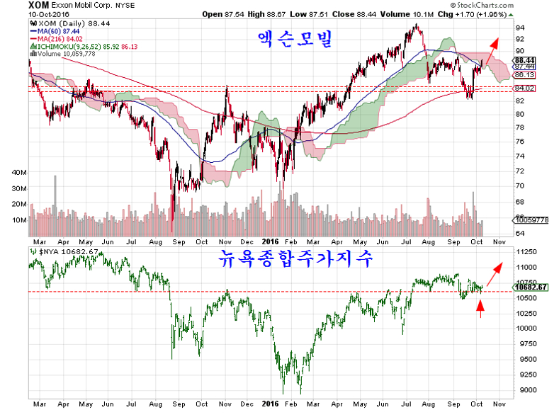 10일 밤 뉴욕시장은 시가총액 1위 기업인 엑슨모빌이 상승하면서 상승이 상승이 이어졌지만 쐐기형 수렴의 기술적 저항을 뚫지 못하고 약간 밀린 채 마감함으로써 저항 돌파를 11일로 미룬 모습이다.