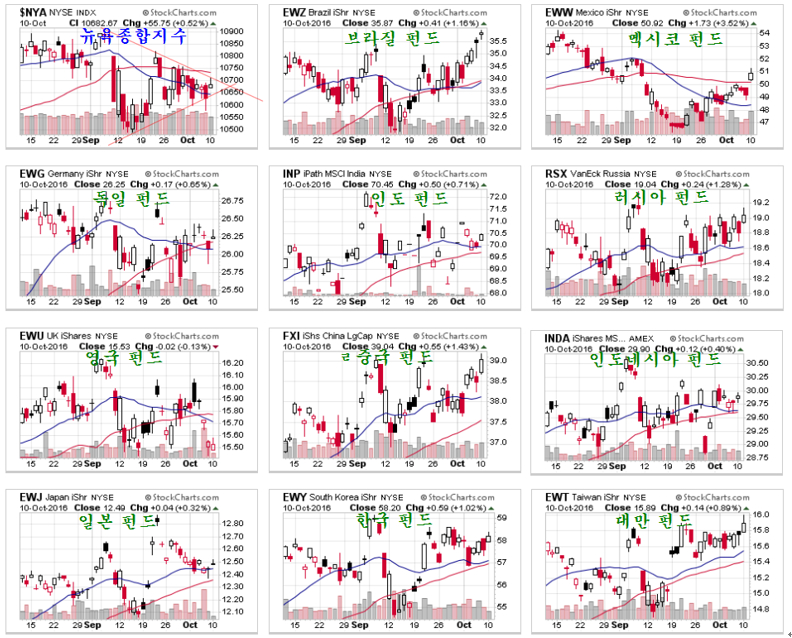 각국 ETF 펀드들은 대체로 비슷한 움직임을 보이는 가운데 브라질 펀드 EWZ가 여타 증시에 비해 다소 앞서는 모습이다. 뉴욕종합주가지수가 상승과 함께 그간 정체하던 각국 증시도 고점을 넘어 상승이 시작될 것으로 보인다.