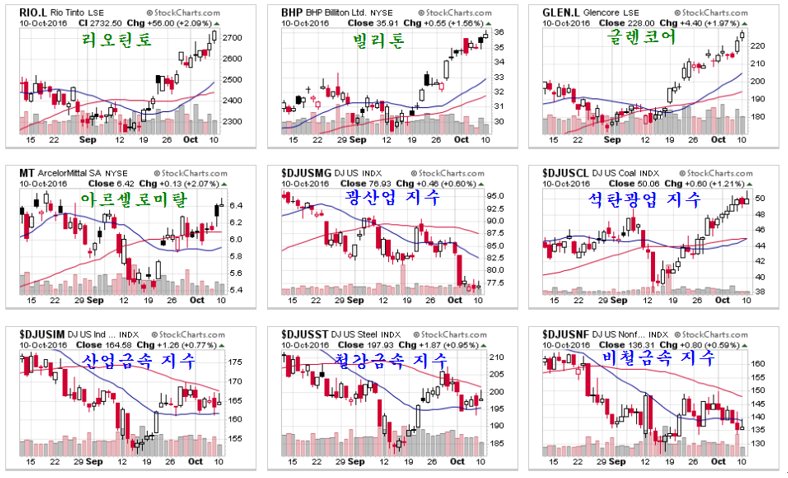 세계 광산업 1위의 리오틴토(런던시장), 2위의 BHP 빌리톤(뉴욕시장), 3위의 글렌코어(런던시장)의 기업들은 세계 최선도주로 사서 보유할 만 하다. 아울러 철강업과 광산업을 아루르는 아르셀로 미탈 MT 도 매수가 유망하며 석탄광업 펀드인 KOL(뉴욕시장)은 최우선적으로 투자할 투자 대상이다.