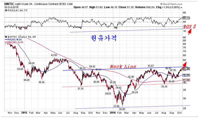 원유가격은 어깨머리형 패턴의 네크라인인 52$에 바짝 접근해 있으며, 일단은 저항을 받겠지만 결국 돌파한다. 이 네크라인이 돌파되면 원유가격의 상승 목표는 105 $로 본격적인 인플레이션 시대가 전개된다.
