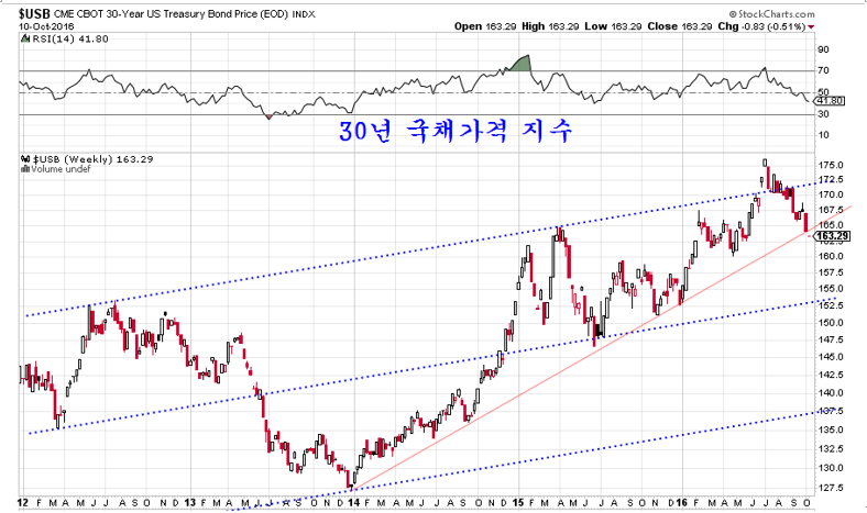 그간 FRB의 환매조건부 채권 매각에 의한 견인줄에 묶어 고공권에 떠 있는 미국 30년만기 국채가격은 FRB가 3400억 달러가 넘는 규모의 환매조건부 채권을 매각했음에도 불구하고 지지선을 이탈해 하락을 시작하고 있다. 더 이상 견인줄이 견디지 못하고 조만간 자유 낙하를 할 가능성이 있다.