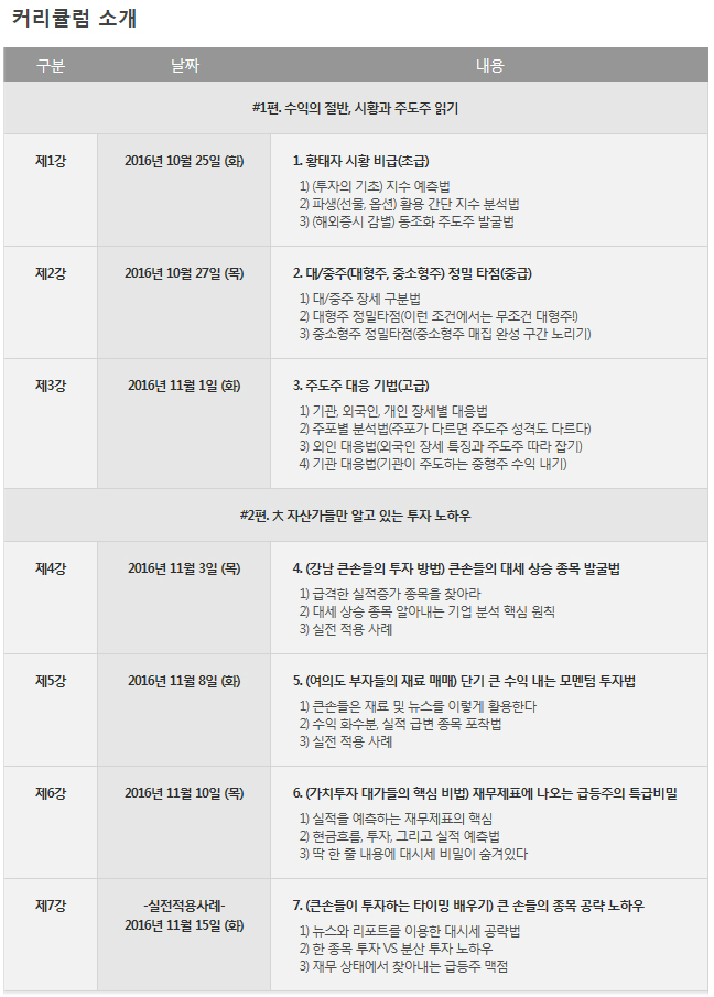 첫 번째, 시장을 읽어야 수익을 낼수 있다는 내용, 두 번째. 주식 큰손들은 도대체 어떻게 종목을 찾아내고 어느 타이밍에 투자하는지, 세 번째는 알고만 있으면 실전에 유용하게 활용할수 있는 핵심 매매 기법. 이런 내용을 중심으로 강의를 진행하고자 합니다.
