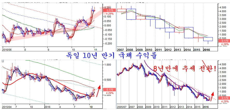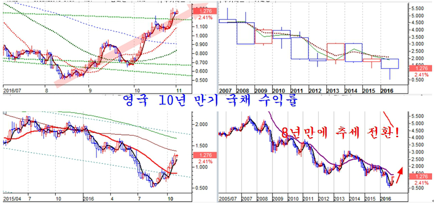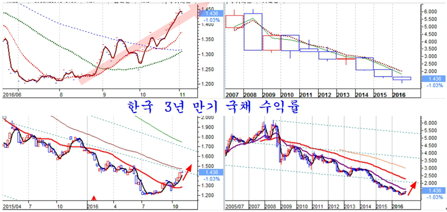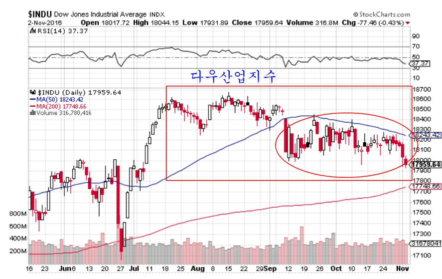 7월 이후 미국 다우지수는 보기 드문 장기 정체 국면이 이어지고 있다. 이것은 아마도 올 미국 대선을 앞둔 불확실성 때문에 적극적인 투자를 하지 않는 측면도 있고, 두번 째로는 채권을 매각하여 주식으로 옮겨야 하는 글로벌 자산 운용사들이 편입할 주식을 값싸게 사기 위해 상승을 억누르는 측면이 있다.