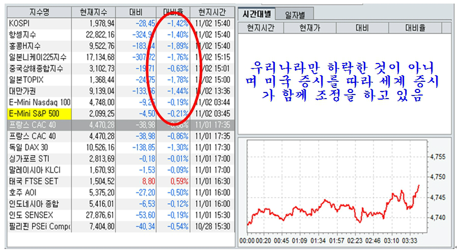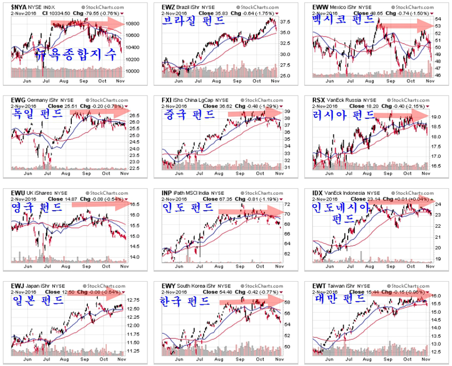 2일 트럼프의 지지율이 힐러리의 지지율을 넘어서면서 불확실성은 더욱 고조되며 미국 증시는 비교적 크게 밀렸고, 이 영향으로 2일 세계 시장은 일제히 하락했다. 이날 한국 증시도 급락했지만 일본과 홍콩을 비롯한 세계 증시가 동반 하락하였다.