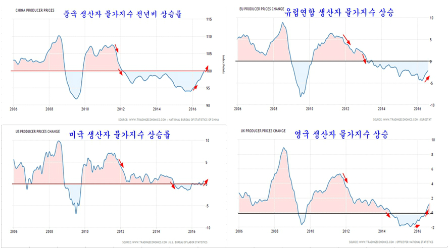 이런 제조업 경기 회복과 함께 하락했던 원자재 가격이 오르고 있으며 이와 함께 생산자 물가지수가 디플레이션에서 인플레이션으로 전환하고 있다.