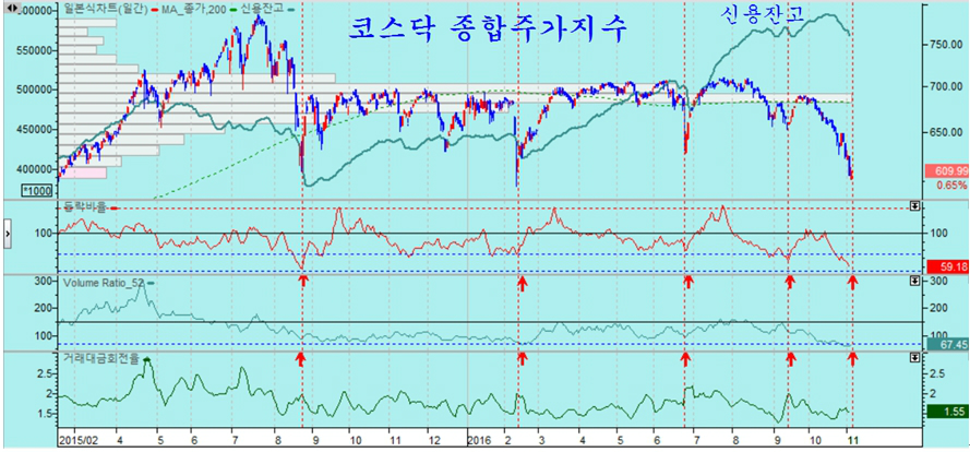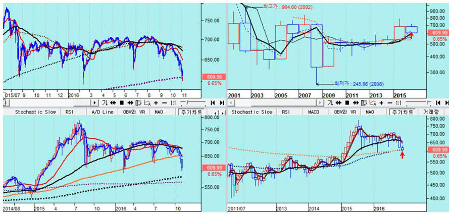 작년 7월 중국증시 하락을 기점으로 하락으로 돌아선 코스닥 시장은 지난 10년래 가장 강한 기관의 매도 행진 속에 급락이 이어졌으나, 주가가 60월(5년)평균과 120월(10년) 평균이 골든크로스하는 지지권에 이르면서 하락이 마무리 된 듯 하다.
