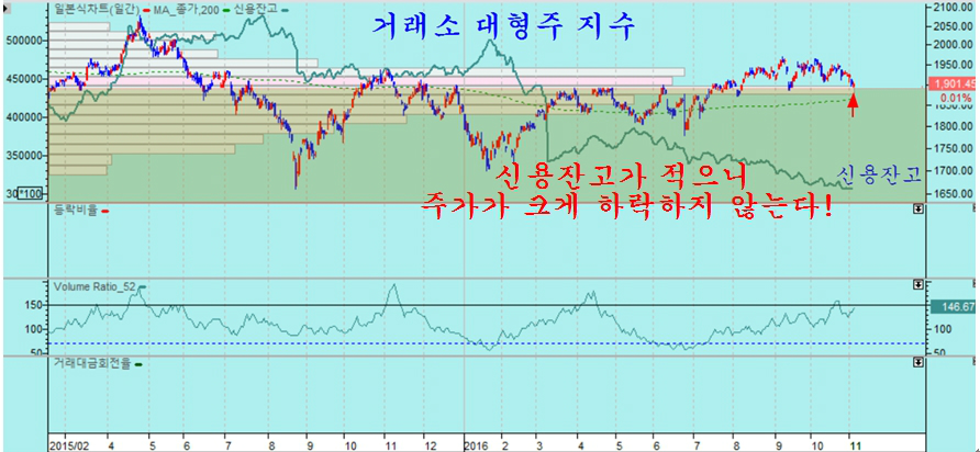 이에 비하면 2015년부터 신용잔고가 계속 감소해왔던 거래소 대형주의 경우에는 거의 조정을 받지 않는 모습이다. 최근 조정과 함께 주가지수가 2000선을 이탈했으나 상승 추세 중 이격 조정으로 가격의 중심선에 이르러 상승이 기대되는 가격이다.