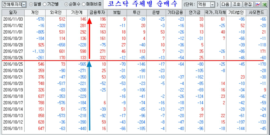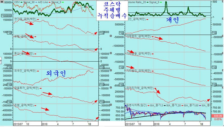 이런 코스닥의 급락은 작년 7월부터 줄기차가 매도를 집중해 온 기관의 매도 때문인데, 지난주 기관의 매도가 마무리 되고 지금은 매수로 전환되고 있다.